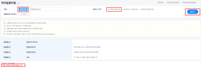 3. 유통기한미사용 체크 > 파일선택 > 엑셀 파일 첨부하여 업로드 시 왼쪽 하단에 결과 값이 나오며 정상으로 처리된 경우 '이동 작업이 완료되었습니다.' 라고 뜹니다.
