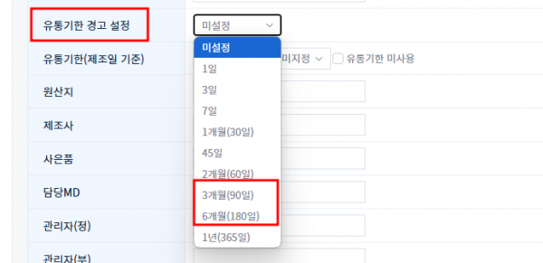 유통기한 경고 설정 기간 3개월(90일), 6개월(180)일 추가 되었습니다. |