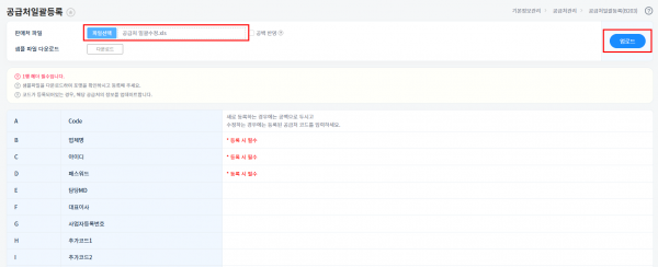 * 파일에서 code를 수정할 경우 기존 공급처로 인식하지 못하여, 정보가 변경되지 않습니다. | * 파일에서 code를 수정할 경우 기존 공급처로 인식하지 못하여, 정보가 변경되지 않습니다. | ||