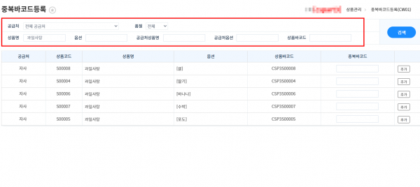 | 2. 팝업창이 활성화 되면, 중복바코드를 등록하고자 하는 상품을 검색합니다. |