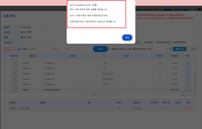 | − | * 주문상품의 수량과 사은품의 | + | 수량 자동계산, 매칭정보 저장이 자동으로 체크 해제됩니다. |