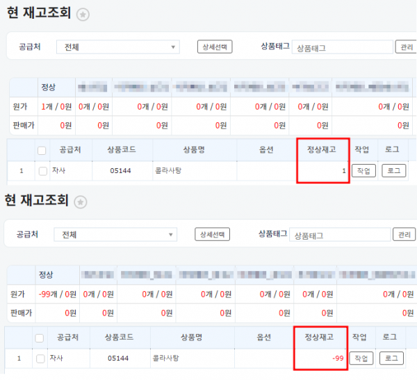 정상재고보다 많이 재고차감되면, 마이너스로 표시됩니다.
