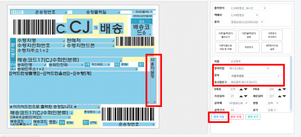 2. 원하는 항목으로 설정 후 문구를 입력한 후 항목 칸의 크기, 위치를 조정한 후 [항목저장] 을 클릭합니다.