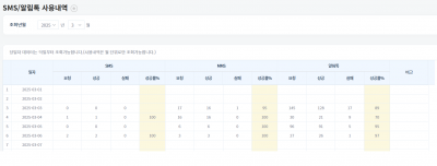 2. 검색년월에 해당하는 SMS, 알림톡 발송요청건수, 발송성공 및 실패 여부, 발송 성공율(%)이 일자별로 조회됩니다.