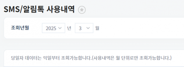 3. 합계에는 해당월 전체 기간동안 SMS, MMS, 알림톡을 사용한 요청/성공/실패수량성공률이 누적 조회됩니다.