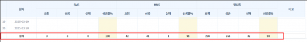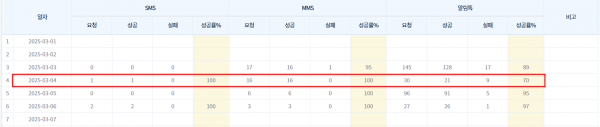 2. 검색년월에 SMS, MMS, 알림톡 발송요청건수, 발송성공 및 실패 여부, 발송 성공율(%)이 일자별로 조회됩니다.