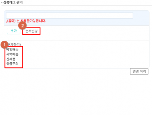 Tip. 각 상품태그를 클릭한 상태로 드래그 하여 위치를 변경한 뒤 [순서변경] 을 누르면 상품태그가 노출되는 순서 지정이 가능합니다. (2024-04-09 업데이트) |