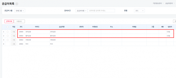 5. 공급처목록 메뉴에서 새롭게 등록된 공급처들을 확인할 수 있습니다.