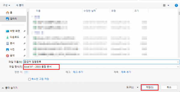 3. 파일 작성이 완료되면 Excel 97 - 2003 통합 문서(.xls)로 저장합니다.