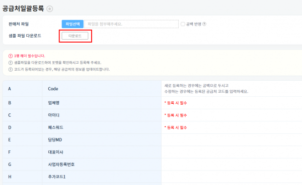 1. 공급처 일괄 등록을 위해 샘플 파일을 다운로드 합니다.