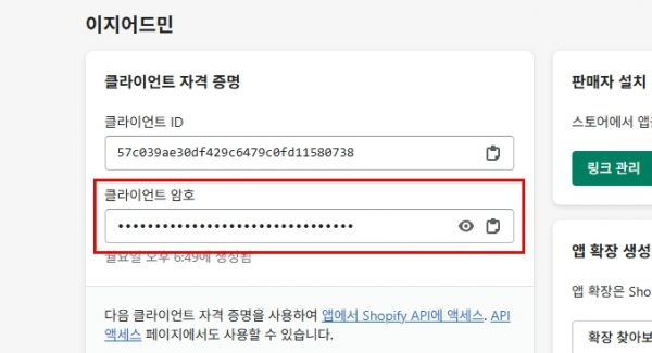 TIP. 쇼피파이 파트너스 > 앱 > 모든 앱 > 등록하신 앱 이름을 클릭하면 클라이언트 암호 항목에서 확인가능합니다.