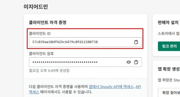TIP. 쇼피파이 파트너스 > 앱 > 모든 앱 > 등록하신 앱 이름을 클릭하면 클라이언트 ID 항목에서 확인가능합니다.