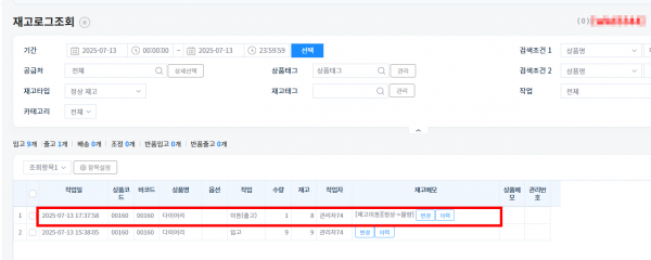 재고로그조회에서는 재고 작업의 상세 이력 조회가 가능합니다.