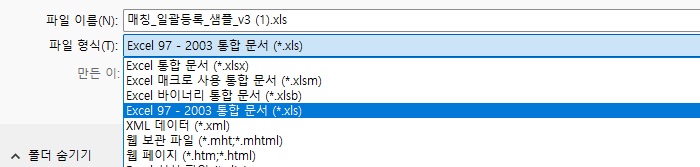 3. 파일작성이 끝나면 Excel 97 ~ 2003년 통합문서(.xls)로 저장합니다.