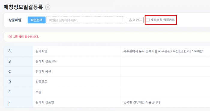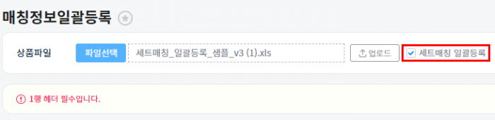 1. 세트매칭하기 위해서는 문답게시판으로 요청주셔야합니다. 세트매칭 일괄등록 가능하도록 환경설정변경해드리고있으며 변경되면 매칭정보일괄등록 업로드 버튼 오른쪽에 <세트매칭 일괄등록>체크박스가 노출됩니다.