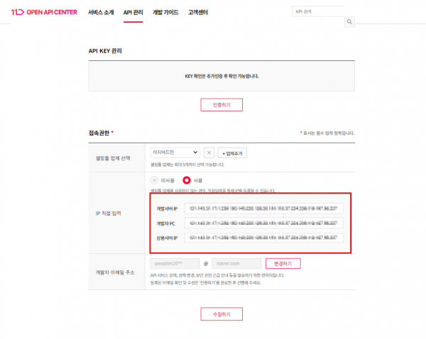 1. 윗쪽 API 관리 클릭> 접속권한 입력 부탁드립니다.