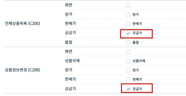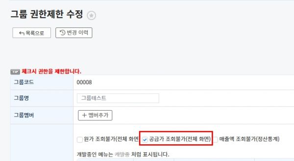 공급가 조회불가 (전체화면) 추가 (2025-11-21)그룹 권한제한 설정에 공급가 조회불가 (전체화면) 추가 되었습니다. 체크시 후 저장시 공급가 항목에 자동으로 체크가 일괄 적용이 됩니다. |