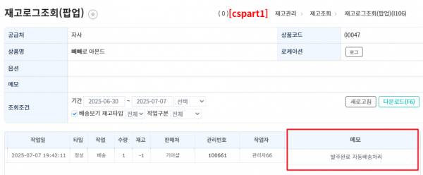 재고 차감이 되어, 재고 이력에도 남겨지게 됩니다. (재고 로그메모: 발주완료 자동배송처리) |