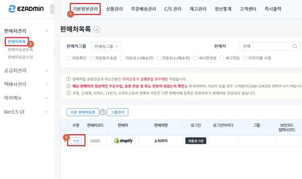1. 판매처목록에서 API 연동할 쇼피파이 판매처 수정 버튼을 클릭합니다.