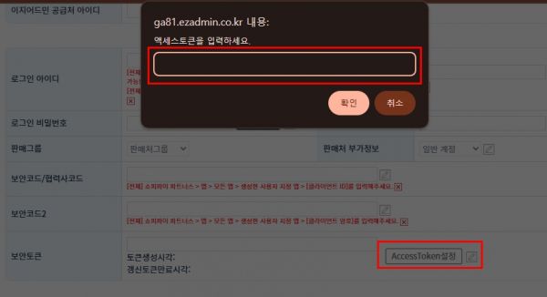 보안토큰 옆 버튼이 [ AccessToken설정 ] 으로 변경됩니다.
