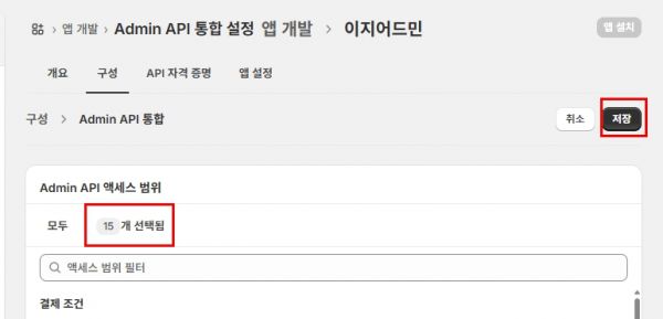 8. Admin API 액세스 범위 에서 하단 표에 있는 엑세스 범위 검색 이후 포함작업 항목체크를 합니다.