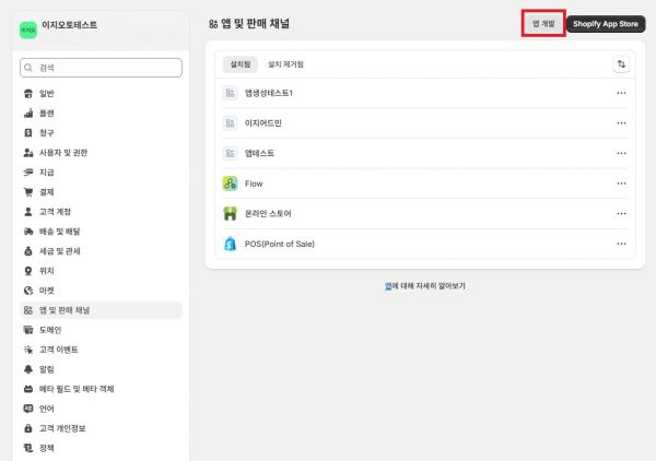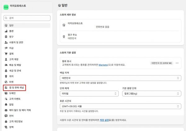 [설정 > 좌측하단 [앱 및 판매 채널] 클릭]