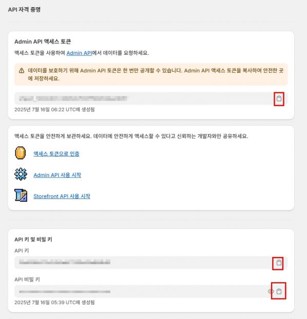 13. Admin API 액세스 토큰과 API 키 및 비밀 키 3개 정보 복사후 이지어드민 > 판매처정보수정에 입력합니다.