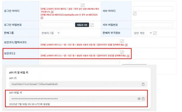 4. 보안코드/협력사코드에 api키 를 입력을 합니다.