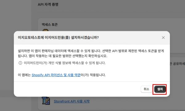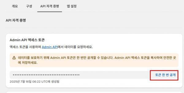 7. 쇼피에서 발급됨 Admin API 액세스 토큰를 입력 후 확인 을 눌러줍니다.