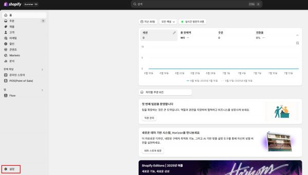 [쇼피파이 관리자페이지 > 좌측하단 [설정] 클릭]