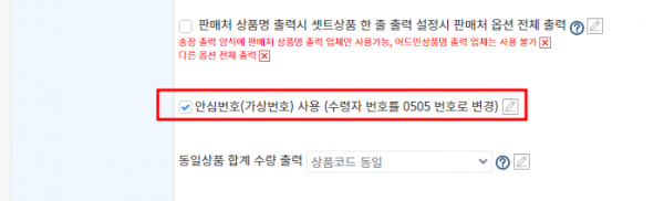 송장출력 시 수령자 연락처를 안심번호로 출력되게 설정하는 기능입니다.