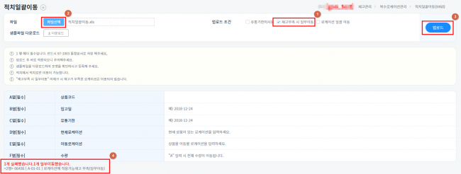 3. 재고부족 시 일부이동 체크 > 파일선택 > 엑셀 파일 첨부하여 업로드 시 왼쪽 하단에 결과 값이 나오며 '1개 실패했습니다. 1개 일부이동했습니다.' 라고 뜹니다.