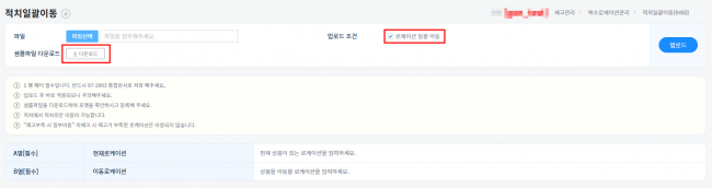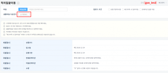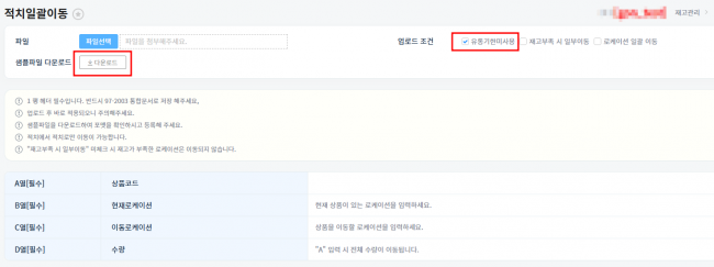 1. 로케이션 일괄 이동 체크 후 샘플파일을 다운 받습니다.
