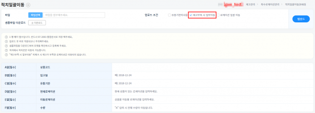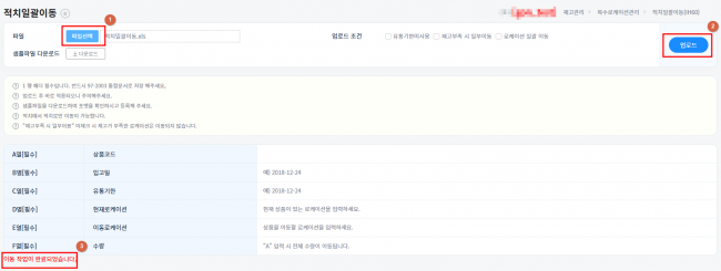 3. 유통기한미사용 체크 > 파일선택 > 엑셀 파일 첨부하여 업로드 시 왼쪽 하단에 결과 값이 나오며 정상으로 처리된 경우 '이동 작업이 완료되었습니다.' 라고 뜹니다.