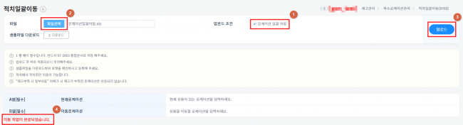 3. 로케이션 일괄 이동 체크 > 파일선택 > 엑셀 파일 첨부하여 업로드 시 왼쪽 하단에 결과 값이 나오며 '이동 작업이 완료되었습니다.' 라고 뜹니다.