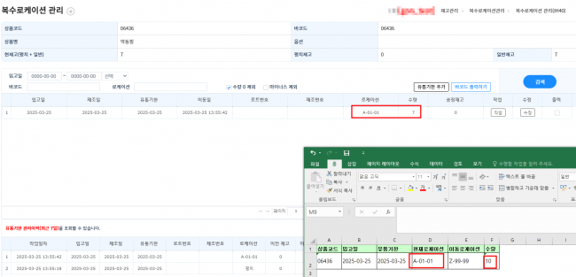2. 예시는 악동핑 상품의 A-01-01 로케이션 재고가 7개이나 10개 수량을 Z-99-99 로케이션으로 옮기는 예시입니다.