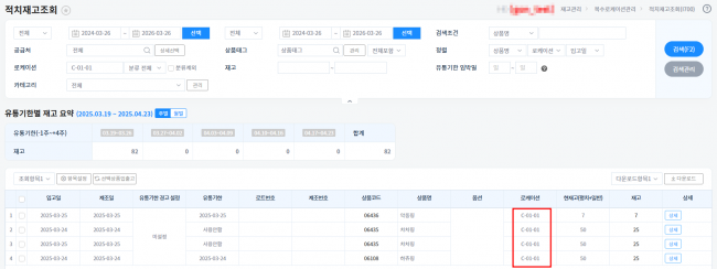 4. 적치재고조회 메뉴에서 확인 시 기존 Z-99-99 로케이션 재고가 C-01-01 로케이션 재고로 일괄 이동처리 된 것으로 확인됩니다.